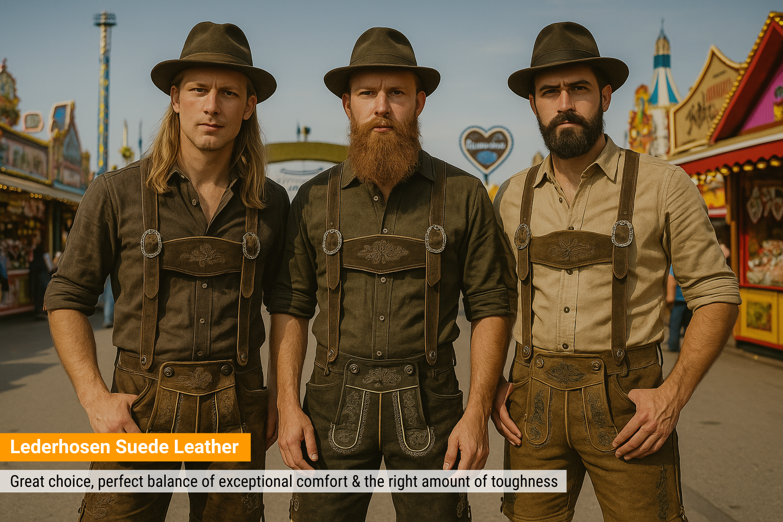 Die traditionelle Hose ist in der Regel kurz oder halblang und hat Hosenträger. Vielleicht hast du sie schon mal im Urlaub gesehen, denn diese kurze Hose aus Leder mit Stickereien und Hosenträgern kommt ursprünglich aus Süddeutschland und wird sehr oft in den Alpen getragen. Es sind nämlich sehr angenehme und dauerhafte Wanderhosen für die Berge. Seit eh und je haben Bauern und Jäger solche Hosen getragen, denn Leder ist abnutzungsfest und ist leicht sauber zu halten. Ein anderer Vorteil ist dass diese Hosen einem wie angegossen passen. Letztendlich. Denn am Anfang fühlen sie sich noch steif an, aber nach einiger Zeit passt sie sich dem Körper an.